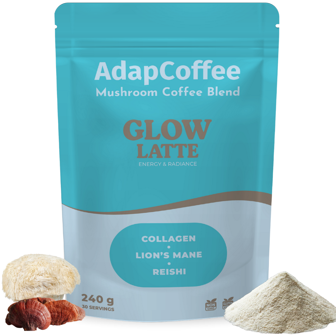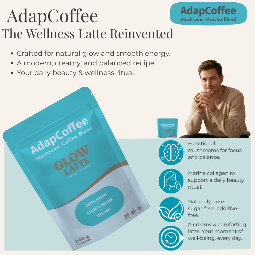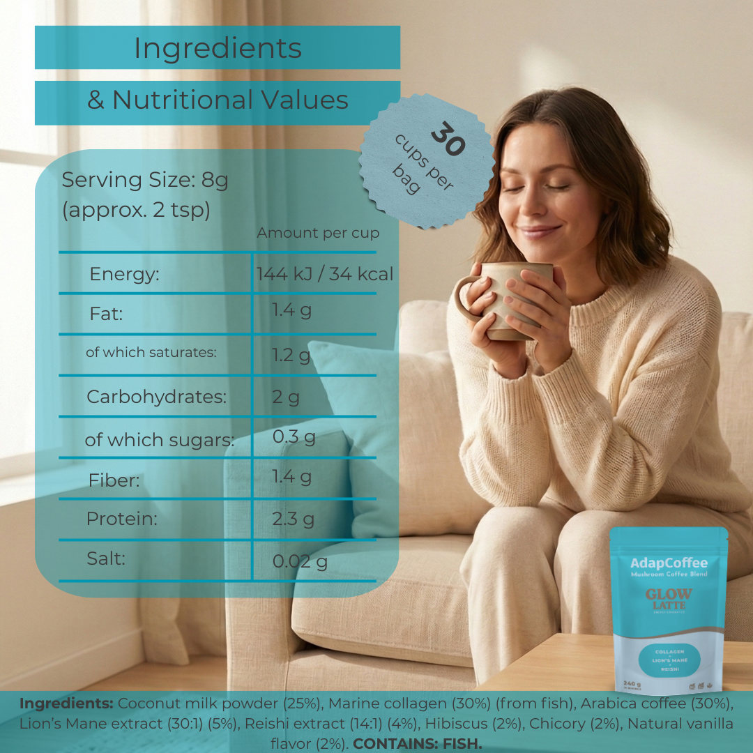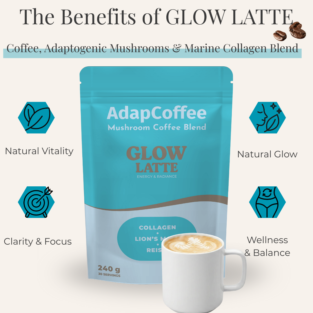 Thanks to its unique combination of adaptogenic mushrooms, marine collagen, and natural ingredients, Glow Latte by AdapCoffee supports your daily routine with sweetness and indulgence: