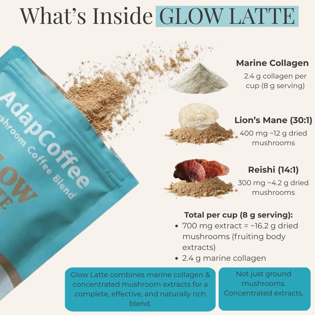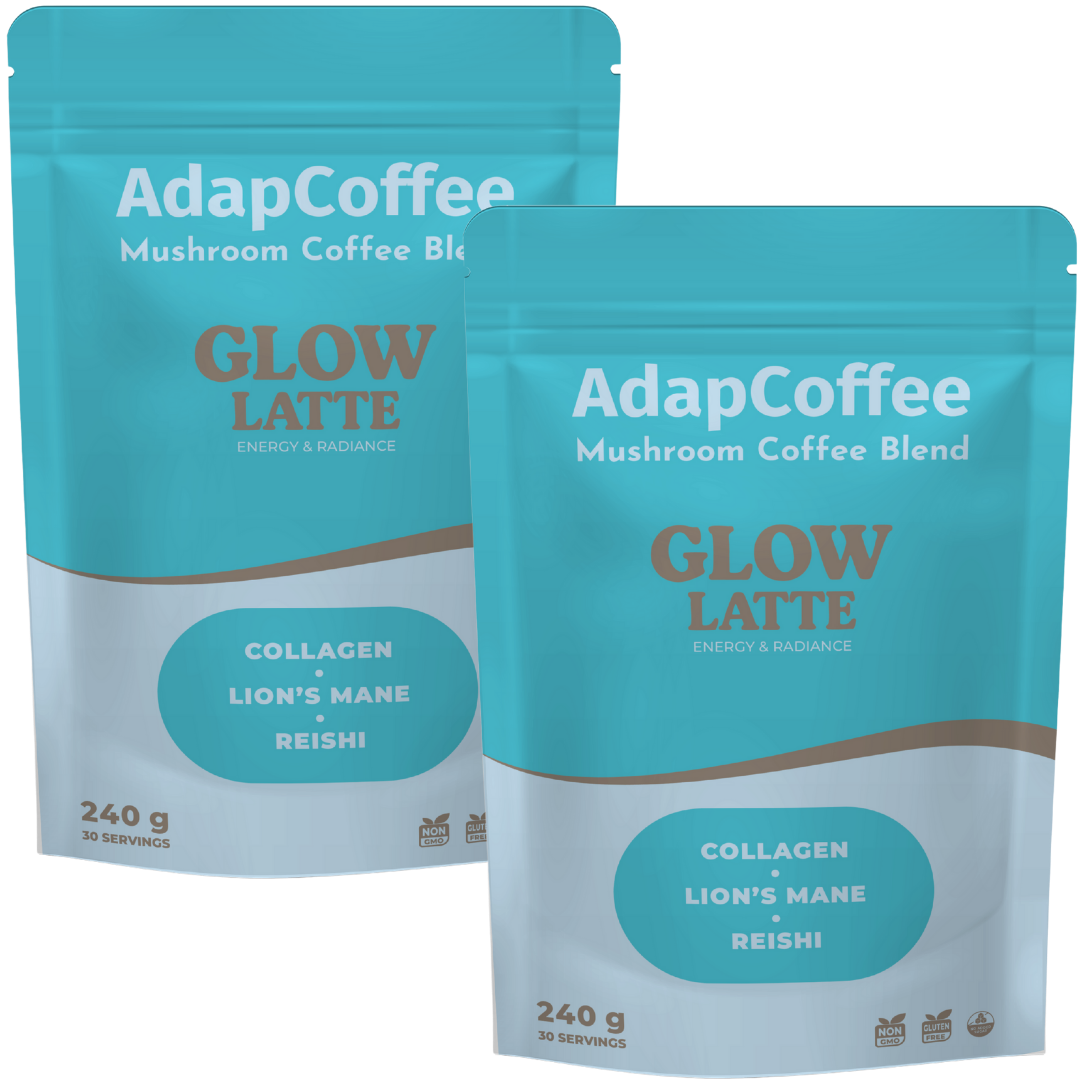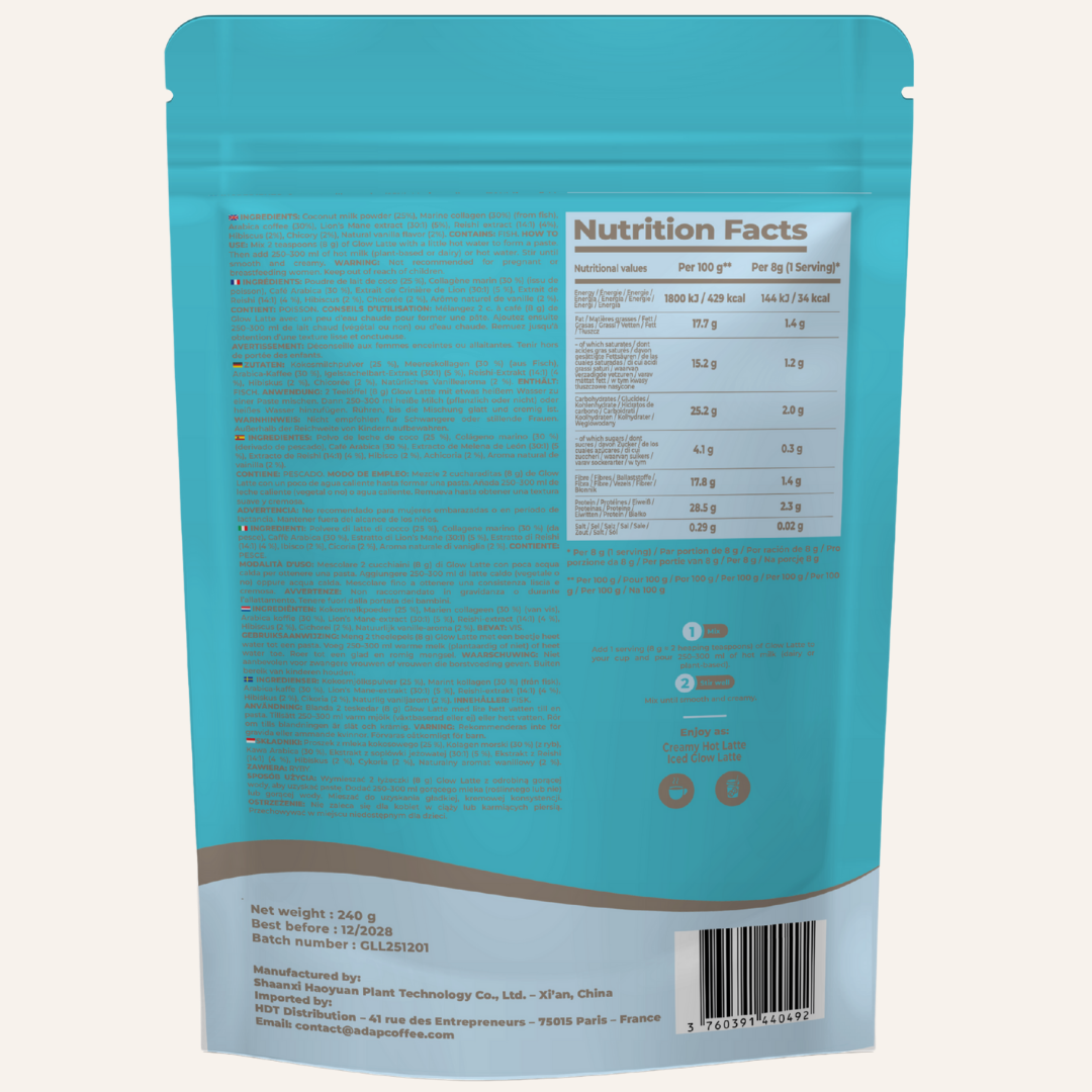 Thanks to its unique combination of adaptogenic mushrooms, marine collagen, and natural ingredients, Glow Latte by AdapCoffee supports your daily routine with sweetness and indulgence: