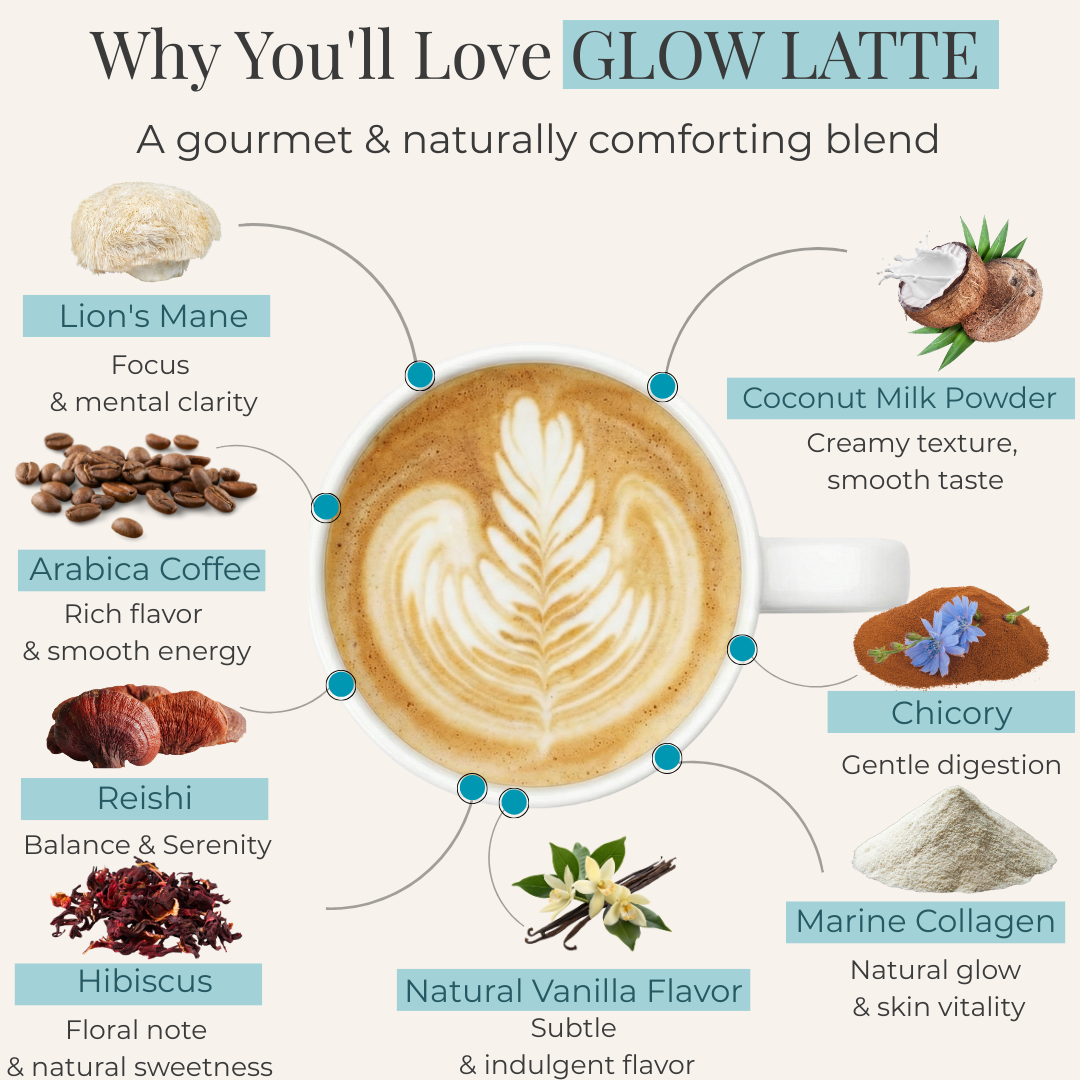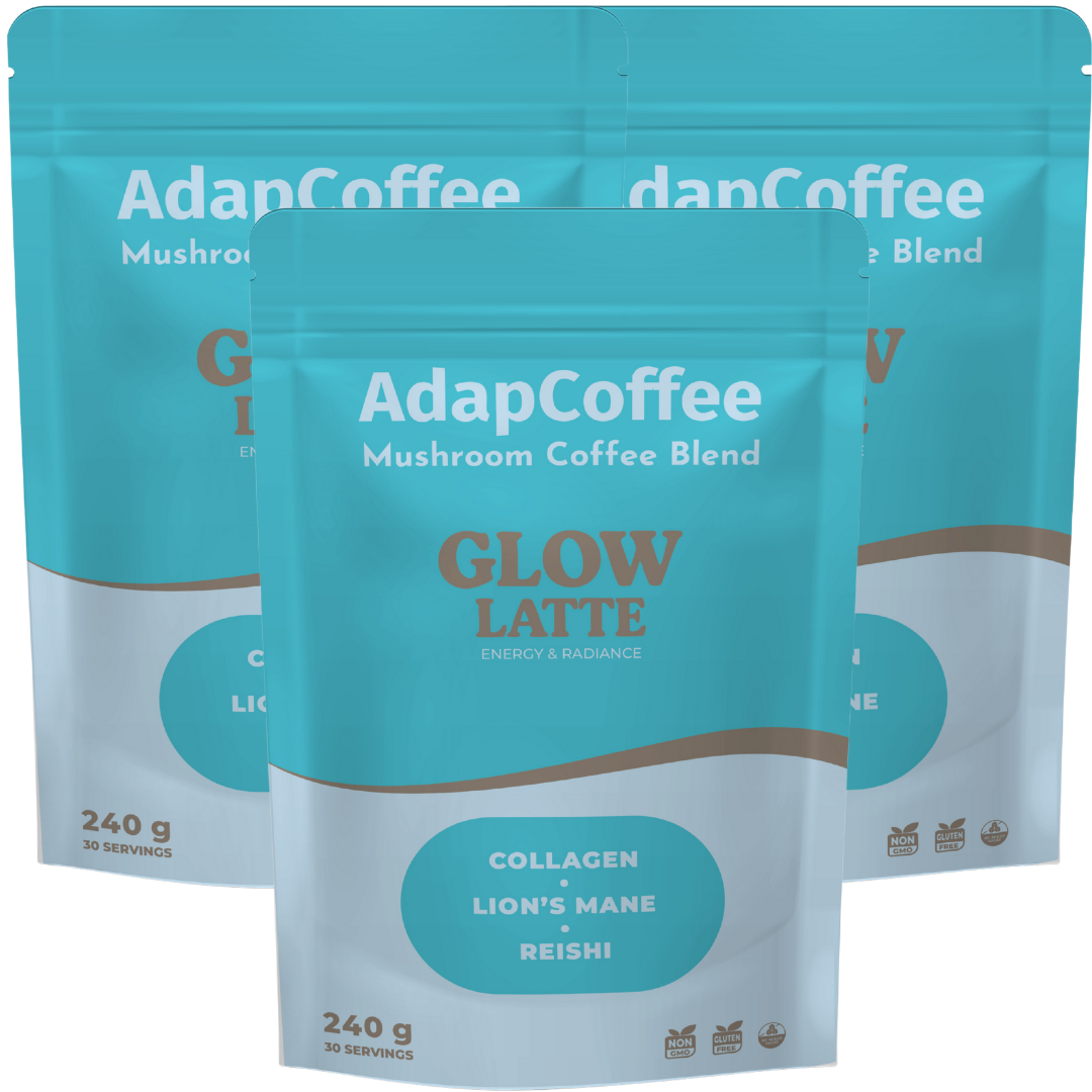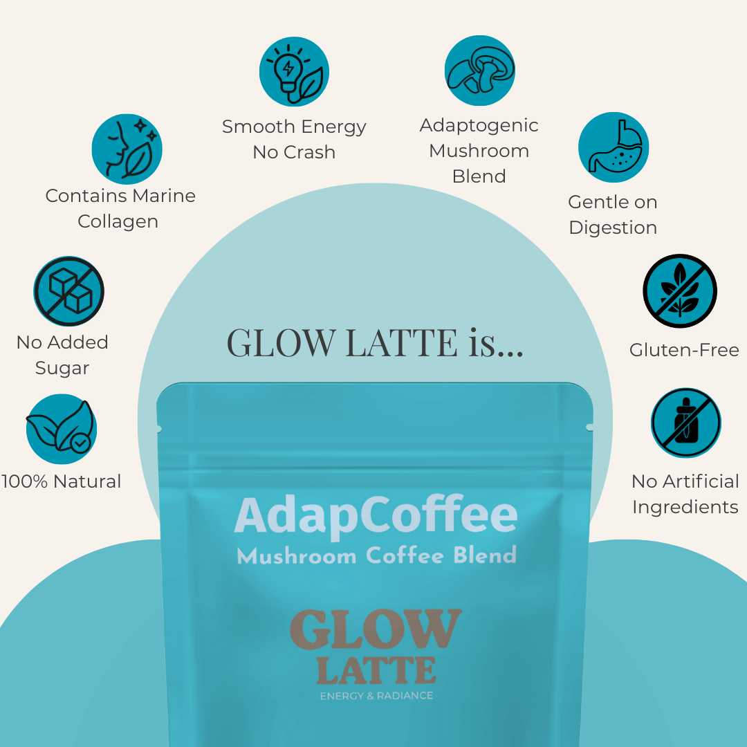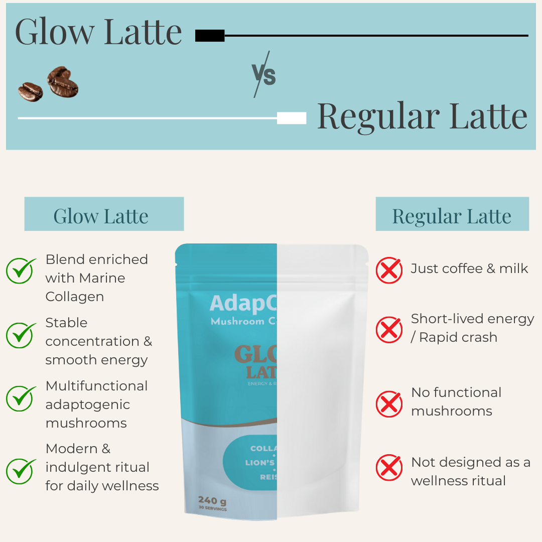 Thanks to its unique combination of adaptogenic mushrooms, marine collagen, and natural ingredients, Glow Latte by AdapCoffee supports your daily routine with sweetness and indulgence:
