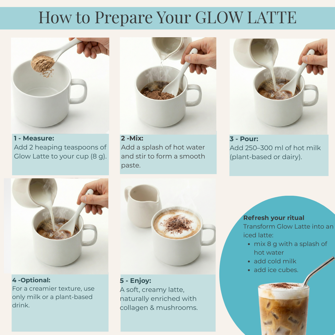 2 heaping teaspoons (8 g) of Glow Latte to your cup. Pour a bit of hot water and mix, then top up with 250 to 300 ml of hot milk (plant-based or dairy). For an even creamier texture, you can use milk only. Glow Latte can also be enjoyed as an iced version: mix 8 g of powder with a little hot water, add cold milk and some ice cubes. Enjoy a smooth, creamy, and comforting latte, naturally enriched with marine collagen and adaptogenic mushrooms.