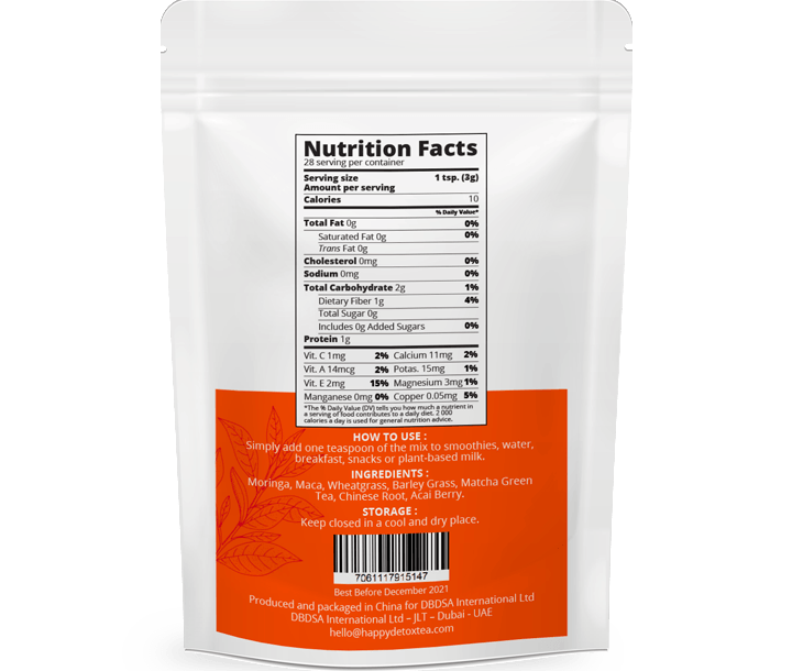 Moringa leaves – Maca root – Wheatgrass – Barley grass – Matcha green tea - Poria Cocos – Acai berry